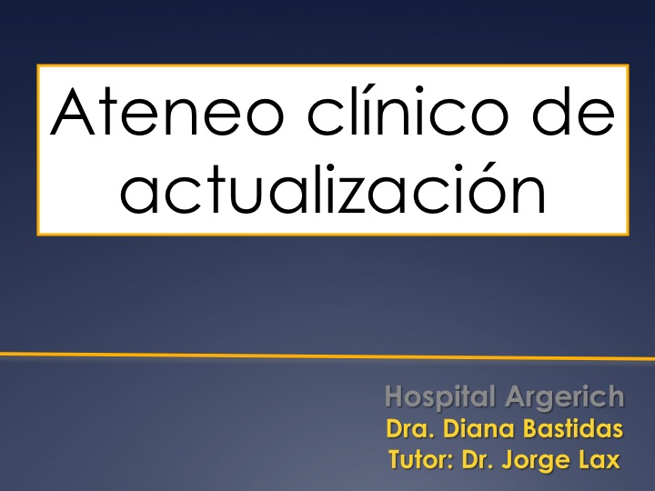 Estimados Doctores, el siguiente miércoles la Dra. Diana Bastidas presentará en ateneo clínico de actualización un caso paradigmático con el fin de realizar una revisión actualizada de la patología referida en la presentación. Para tal causa el tutor será el Dr. Jorge Lax. Este es el último ateneo del año, por lo que les deseamos FELICIDADES !!!!!!!!!!!!!!!!!!!!!